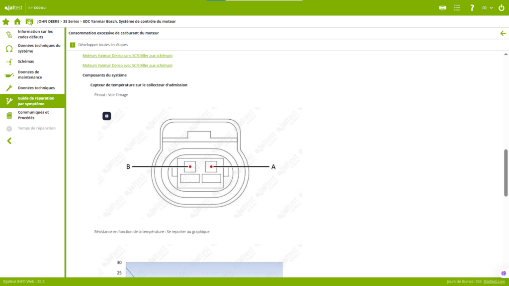 Grâce à Jaltest INFO Web, vous accédez à des informations détaillées sur les causes possibles du défaut, aux schémas techniques et aux procédures constructeur, ce qui simplifie considérablement l’intervention.