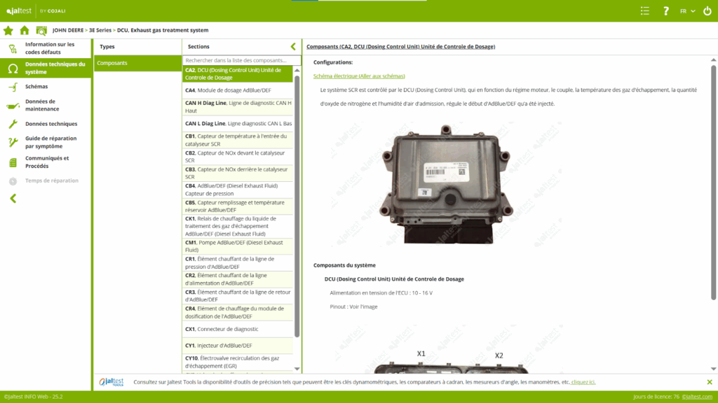 Chaque cause peut être isolée grâce au diagnostic Jaltest INFO WEB, qui affiche le code d’erreur et la procédure à suivre selon la marque (John Deere, New Holland, Fendt, etc.).