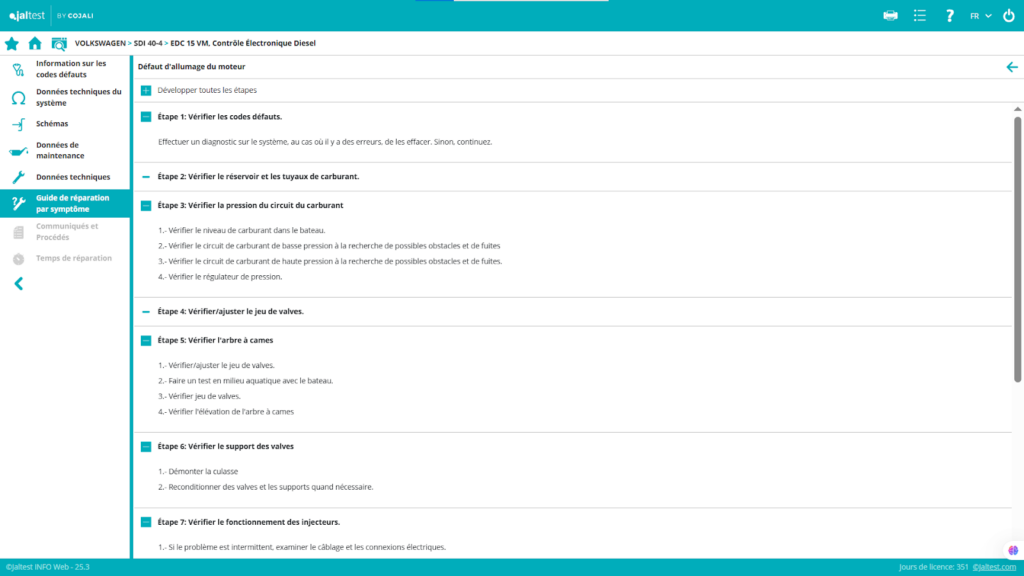 Lorsqu’un problème électrique survient, la première étape consiste à vérifier les codes d’erreur du système via Jaltest Marine. Pour le Volkswagen SDI 40, des erreurs courantes incluent des problèmes de connectivité dans le circuit de carburant ou des défaillances du régulateur de pression. L’outil vous indiquera précisément les codes d’erreur, comme une défaillance dans l’alimentation ou des courts-circuits dans les câblages.