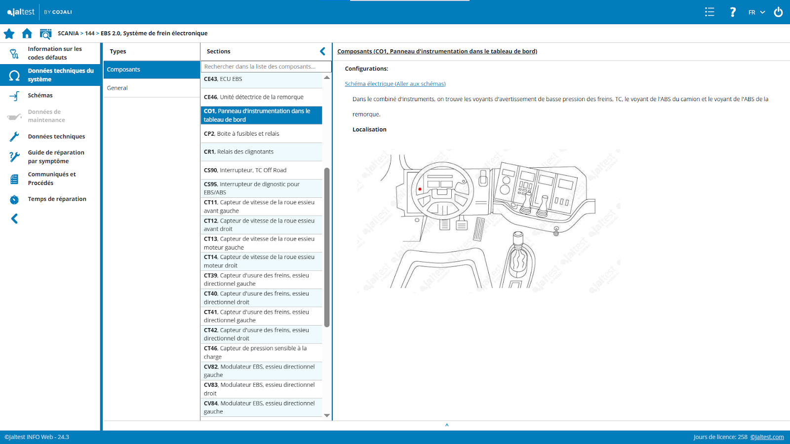 Les schémas de câblage sont une aide précieuse pour tout technicien. Jaltest fournit des schémas clairs et interactifs pour chaque système du camion : ABS, moteur, transmission, freinage, etc. Vous pouvez facilement suivre les circuits électriques, identifier les connecteurs et accéder rapidement aux points de test.